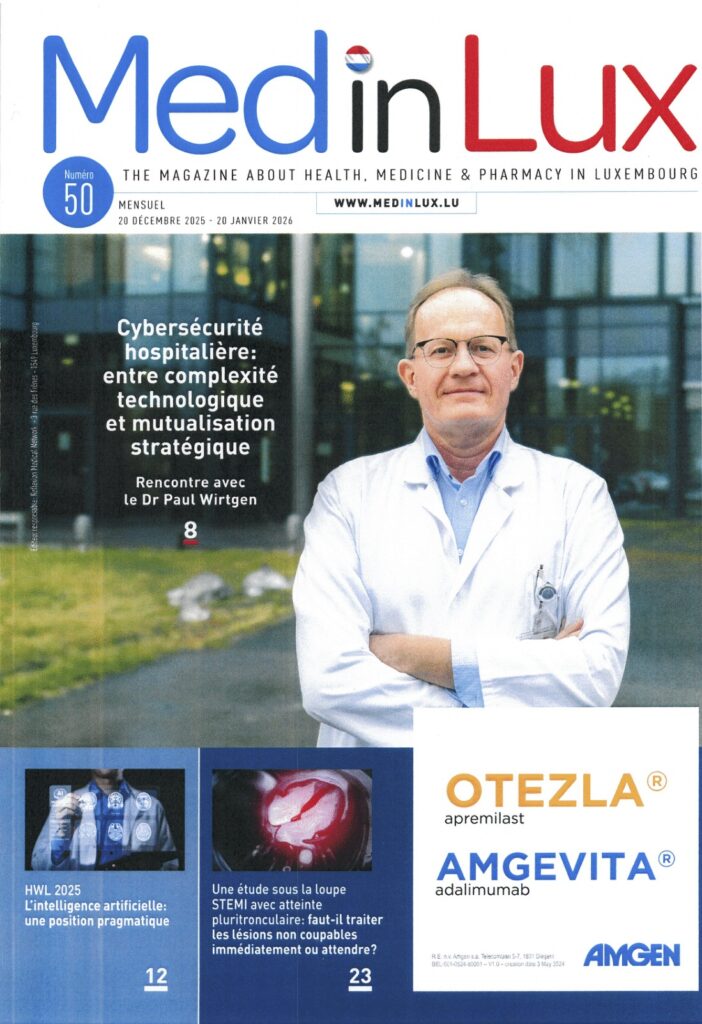 Blëtz a.s.b.l. est très fière d’être mentionnée dans le dernier numéro de MedInLux (n° 50/2025), qui consacre quatre pages à l’accident vasculaire cérébral (AVC) abordé sous différents angles. Destiné principalement aux professionnels de la santé, ce numéro met en lumière les enjeux actuels liés à la prise en charge de l’AVC au Luxembourg. Un grand merci à Jean-Pol Leblon et au Dr Jean-Yves Hindlet pour cet échange enrichissant et pour la qualité de cet excellent article.